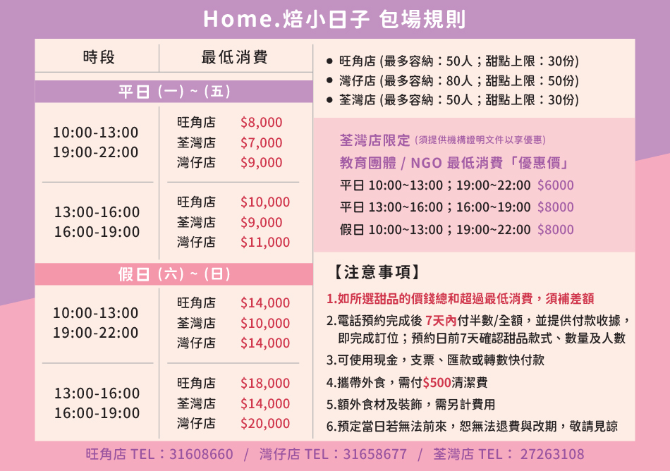 Home.焙小日子 香港各分店包場規則